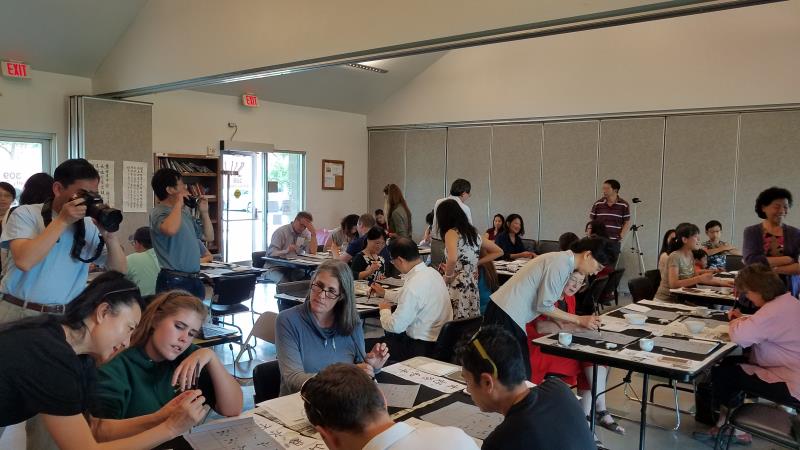 此刻的桌面似乎稍显拥挤,书法水写布、字帖、毛笔、水盘和笔架等各种书法用品布满宽大的台面。感谢现代科技的神奇,让一抹清水能在书法水写布上呈现出墨迹般的痕迹。来宾们正式开始书法实战。几位华裔儿童来宾在父母的帮助下很快进入了角色。非华裔来宾们也毫不示弱地按照书法字帖的模样开始练习。可以看出,中国书法让一些用惯了硬笔工具的来宾有了一个全新的体验,就象武士拿起了绣花针,有点乱了方寸。见状,为准备讲座现场而忙碌了一个中午的义工们纷纷上前,为需要指点的来宾提供帮助。