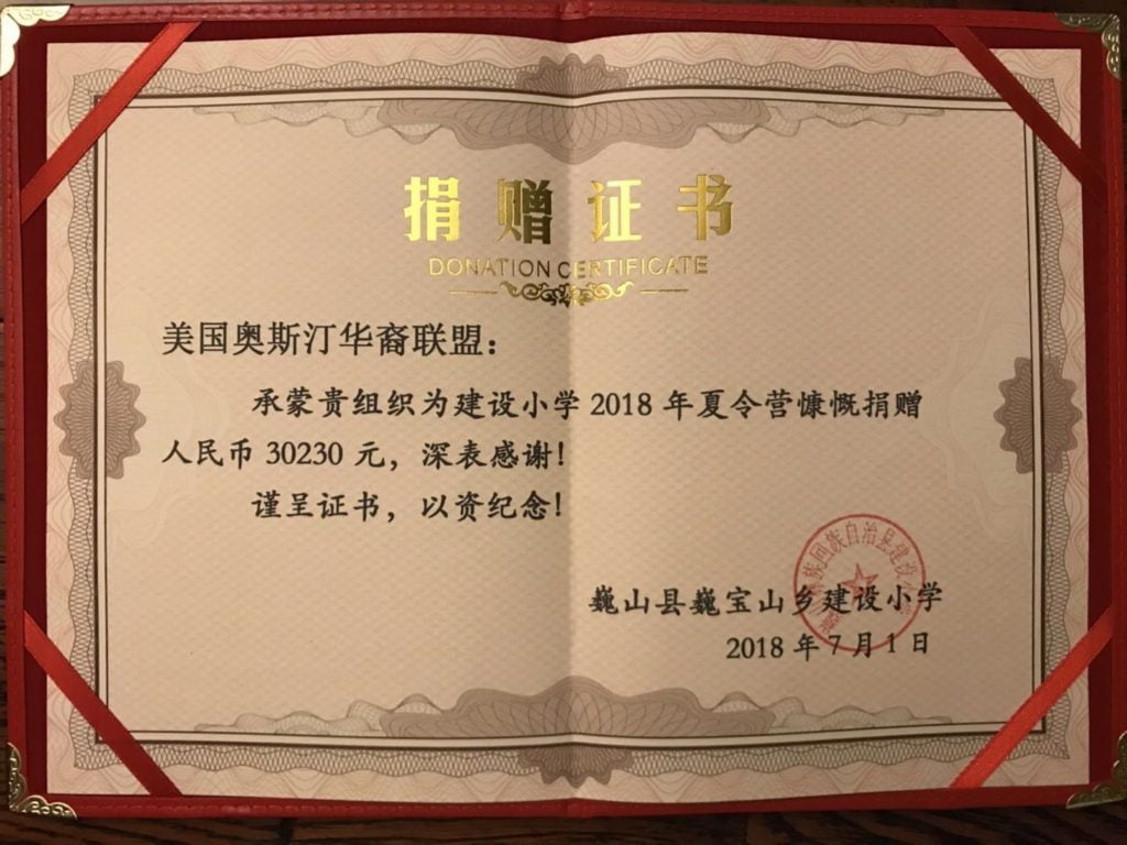 华盟会员们在了解到此项捐款既无法利用公司匹配,又不能抵个人收入税的情况下,仍毫不犹豫的慷慨解囊,或用美金PayPal 或用微信转账,在不足一天的时间里,五十来位会员就捐了超出目标$4000 的善款. 爱心及行动力都让人感动至深. 特别是在组织者巳喊停的情况下,仍有会员私信要求一定要算上他们的捐款. 由于Austin 华盟会员们的爱心,巍宝山建设小学留守儿童们住校夏令营活动的经费得到了保障. 为此,巍宝山建设小学为我们慷慨奥斯汀华盟人颁发了一本烫金的”捐款证书. 请参见附图.