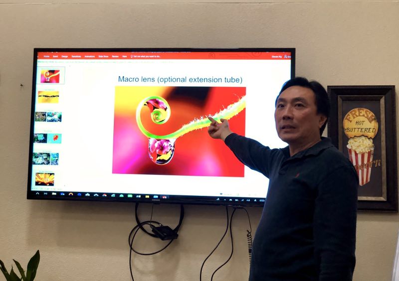 华盟理事及华盟摄影组负责人锺斌是这次活动的组织者。他首先帮助大家重温了摄影技术的ABC知识, 诸如,光圈(aperture)、焦距(focal length),镜头(lens)及其分类和使用等。在此基础上,本地资深摄影师,Steven Ng, 把大家的注意力引向了摄影微距镜头(macro Lens)技术在花卉摄影上的运用。Steven通过向大家展示和讲解几幅他自已及他人的花卉摄影作品例子,让大家看到了摄影技术的广阔应用天地,以及光的折射作用赋予花卉的奇特艺术效果和感染力,令学员们无不惊叹。