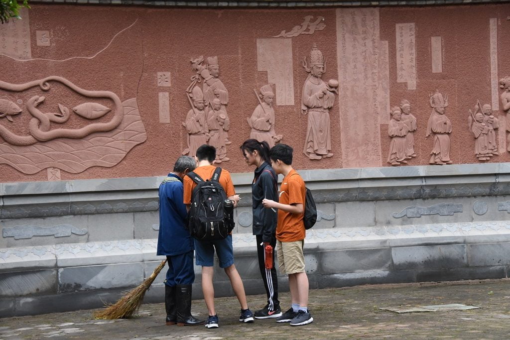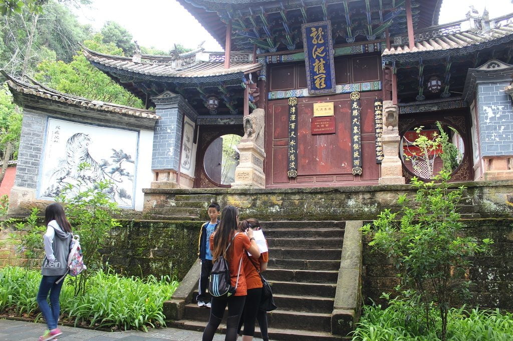 听打扫的老妪了解到黄龙潭的神秘过去。百度上说“初为本地土著彝族祭龙潭之所,两汉时彝师孟获之兄孟优曾居此修炼,相传诸葛亮七擒孟获时,因士兵误饮哑泉水,不会说话,诸葛亮曾亲往殿内访问孟优解药以救士兵。” 灵官神像的手势让小老外们大开眼界。竖着中指居然被人们崇拜?问了道长知道那是“忠心不二“的意思。