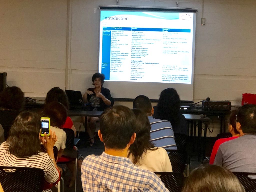 随后,华盟常务理事Angela Qian作为经历了两次高中生毕业申请过程的妈妈,用她精心制作的PPT,分享了高中生申请美国大学的个人经验体会。她声明,这些分享属于个人经验,仅供大家参考。她提供这次分享的目的是为了帮助从未经历过大学申请的华人家长们多了解具体的步骤和注意事项,对孩子有更多的理解,能为孩子提供更多的支持或帮助,并且家庭可以减少不必要的焦虑和烦扰。Angela谈到大学意向名单,校园参观,common application网站的填写,找推荐信的老师的时间,申请类型与不同的截止时间,奖学金机会, 标准化考试SAT和ACT的不同特点和时间安排,高中课外活动的列表和自己所报专业的关系,Essay的写作要求。她特地提到UT有许多不同的honor program, 需要提交不同的essay。她建议学生珍惜ED/EA机会,有助于提高自己进入梦想学校的概率。她鼓励家长们多了解这一过程,陪伴孩子做好离家前重要的这一步,当好孩子的后勤,鼓励孩子的独立与成长。