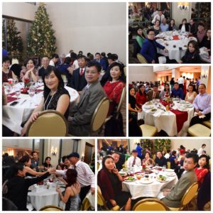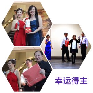 晚宴的菜单包括牛排,三文鱼,蔬菜,和诱人的甜品。朋友们拉家常,品红酒,尝美食,回味 2018,展望新的一年。海阔天空,说不完的话,道不尽的感慨。席间群主陈艳女士轮流向各桌朋友敬酒,预祝大家新年快乐。主持人许瑾女士请客人们拿出签到时领取的彩票,开始第一轮礼品抽奖。王涌波(Debbie)与其他几位会员从各界朋友及商家那里共筹集到价值超过千元的抽奖礼品和价值三千多元的竞拍礼品。当大家了解到竞拍收入将全部捐赠给华盟以支持明年2月16日的文化节筹备,用过餐的客人们把长长的礼品竞标台围了个水泻不通,争相在中意的竞标单上写上自己的名字。这次晚会的礼品拍卖为华盟筹集了二千多美元的善款,为宏扬中华文化贡献一份力量。