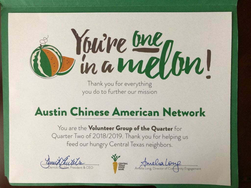 结束时,Texas Food Bank给华盟颁发了季度最佳组织奖。大家为华盟喝彩,也为自己骄傲。华盟在成立以来的短短两年里,带动越来越多的华人家庭参与社区服务,对奥斯汀的贡献得到越来越多的承认。愿我们今后做的更多、更好!