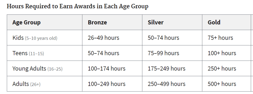The President’s Volunteer Service Award Levels include bronze, silver, gold, and the highest honor, the President’s Lifetime Achievement Award for those who contribute more than 4,000 hours of service in their lifetime. Please see the hours requirements for each level below.